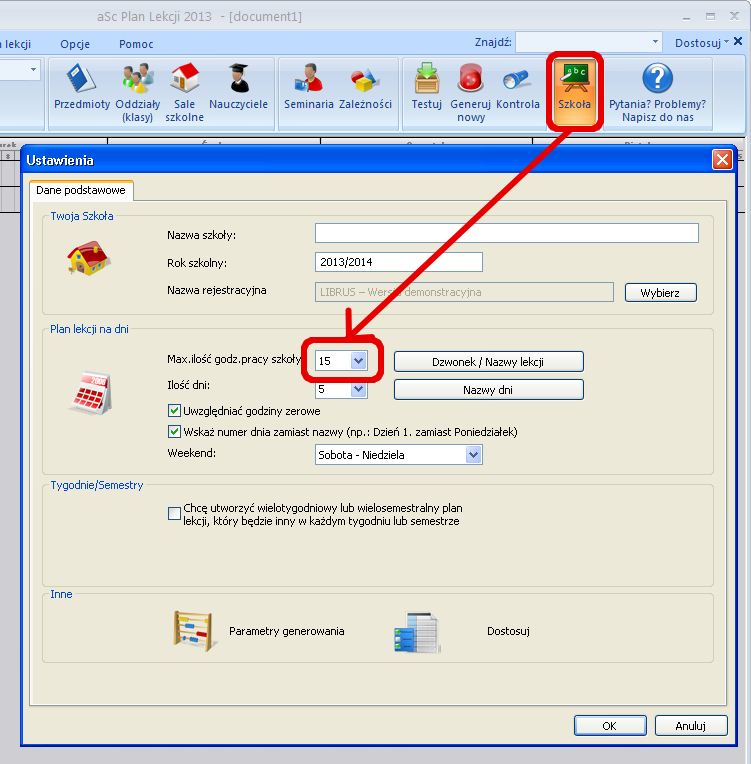Jeśli ilość zajęć na schemacie jest mniejsza, np. 7 zamiast 15, należy zmienić ich maksymalną ilość, zaznaczając kartę Główny, a następnie wybierając pozycję Szkoła i w nowo otwartym oknie podać odpowiednią ilość zajęć.