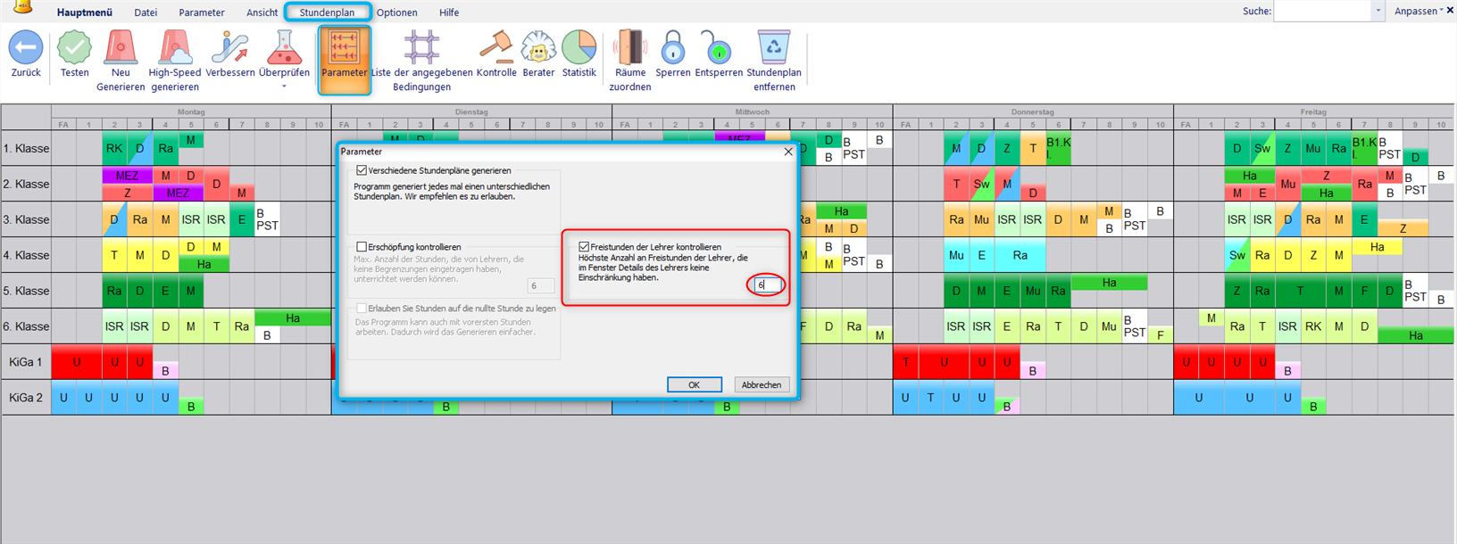 Sie können die maximale Anzahl an Freistunden pro Woche direkt in den Einstellungen unter Parameter angeben, damit Sie einen Überblick über die anfallenden Hohlstunden aller Lehrpersonen in Ihrem Stundenplan behalten.