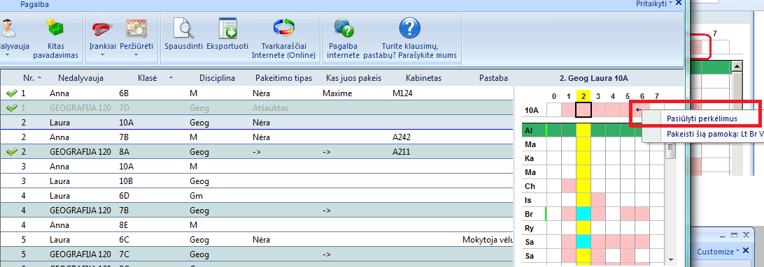 Atsivers toks langas. Programa pasiūlys atšaukti 2-rą pamoką ir perkelti 6-tą pamoką į jos vietą.