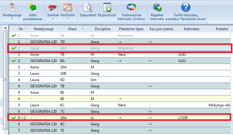 - "perkeltos" pamokų eilutės bus nuspalvintos kita spalva.