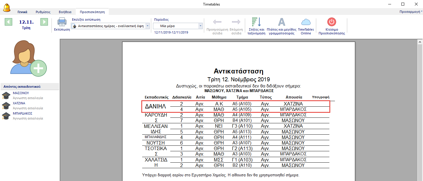 Εδώ, στην πρώτη στήλη εμφανίζεται ο εκπαιδευτικός που πρέπει να ενημερωθεί. Για παράδειγμα, στην παρακάτω εικόνα ο εκπαιδευτικός "Α" ενημερώνεται ότι: