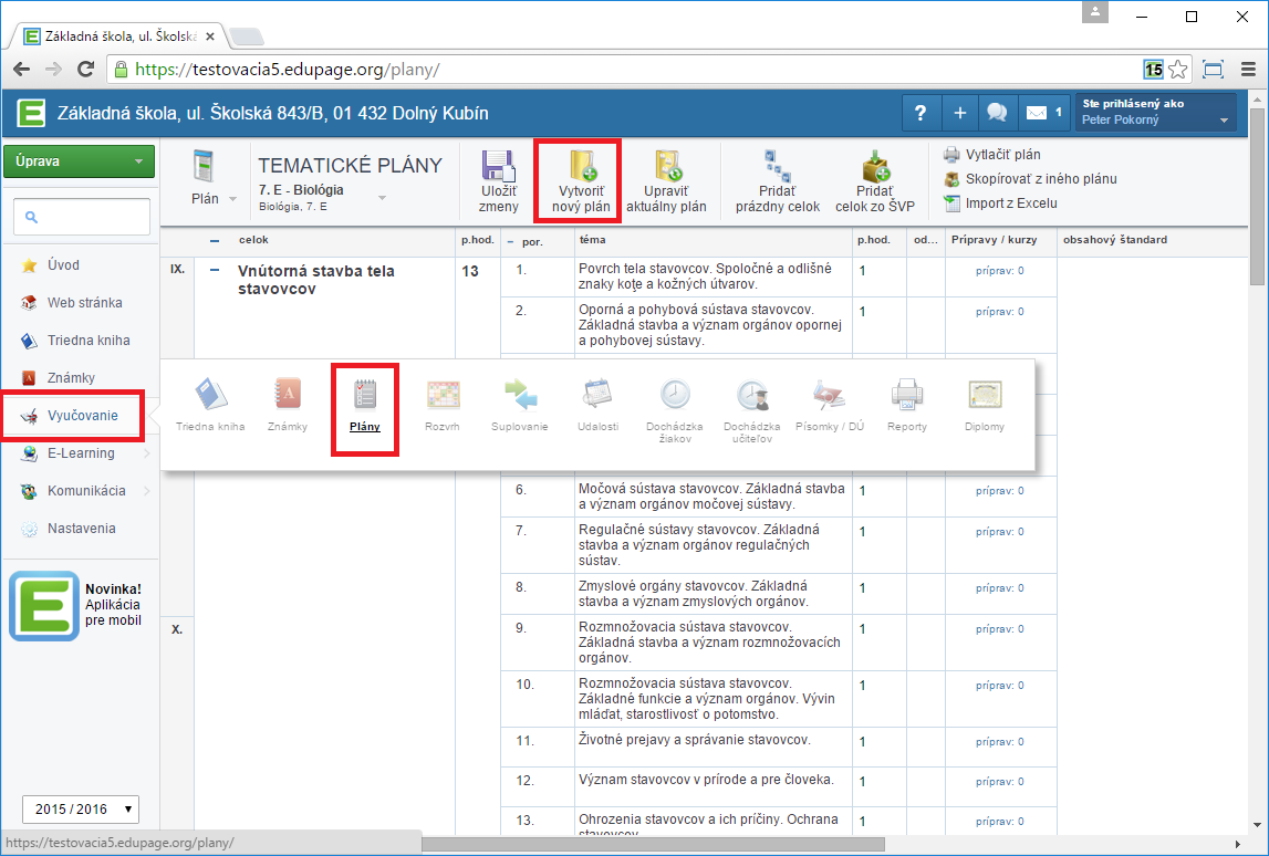 Prihláste sa do EduPage rovnakým menom a heslom ako do žiackej knižky a v ľavom menu "Vyučovanie" vyberte položku "Plány" a kliknite na "Vytvoriť nový plán":
