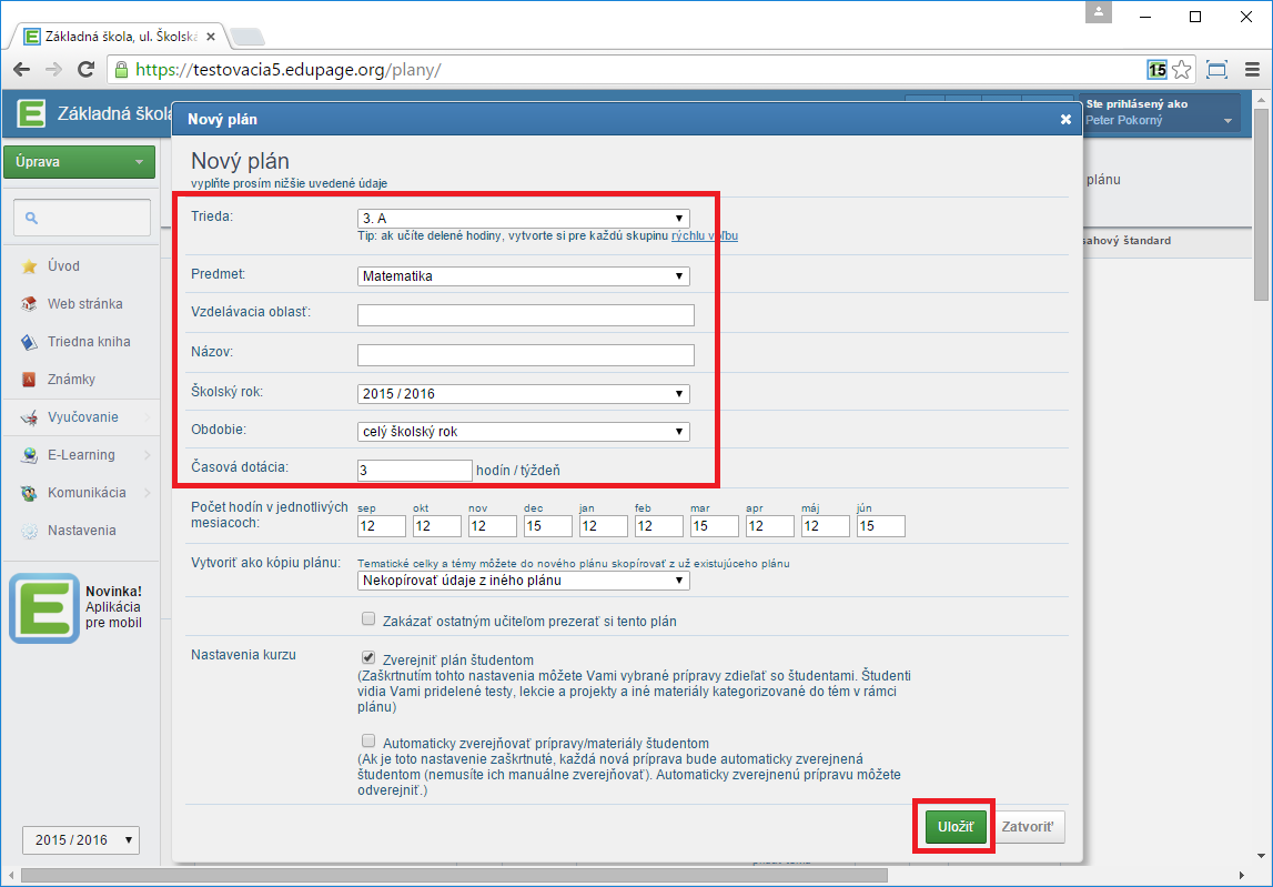 Objaví sa tabuľka, kde môžete zadať názov plánu, vybrať triedu, predmet a časovú dotáciu hodín na týždeň. Program vám automaticky vypočíta počet hodín v jednotlivých mesiacoch. Ak potrebujete, môžete si počet hodín v mesiaci zmeniť pomocou posuvníka. Dokončíte kliknutím na tlačidlo Uložiť.