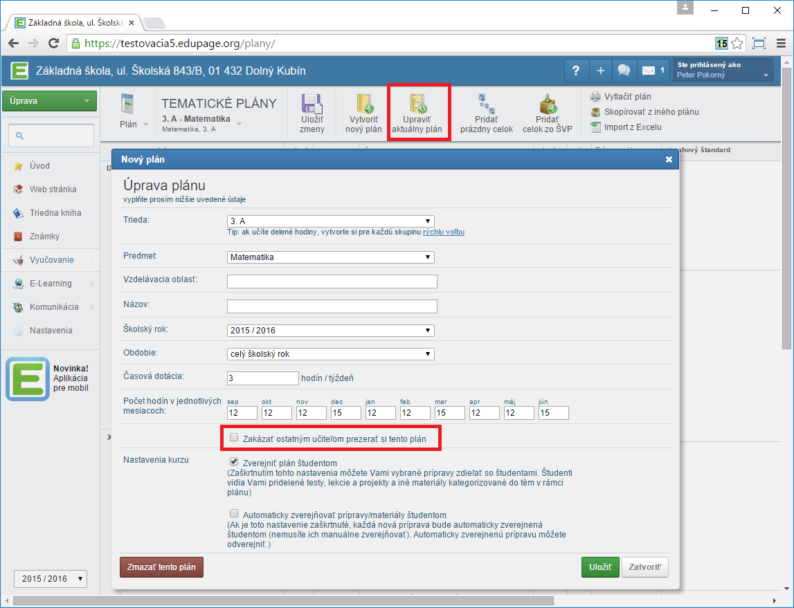 Každému plánu môžete povoliť, či ho budú môcť prezerať ostatní učitelia. Zdieľanie plánu nastavíte voľbou "Upraviť aktuálny plán".