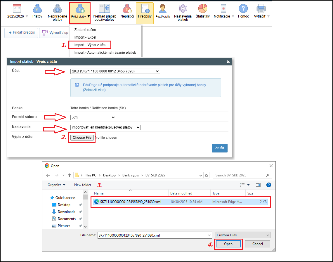 -> pozrite si v EduPage aký formát bankového výpisu je podporovaný pre vašu banku a takýto si stiahnite v internet bankingu