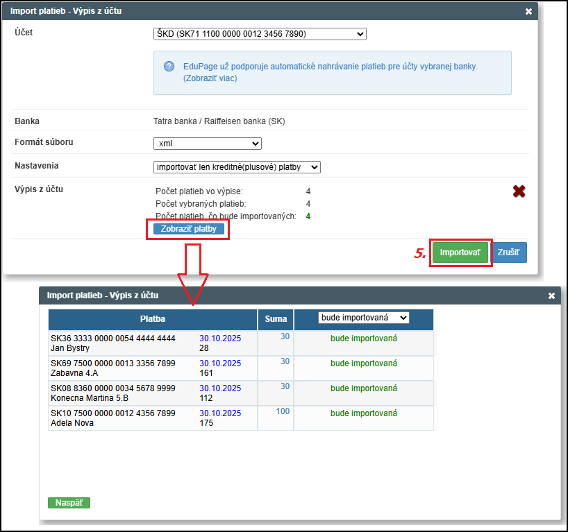 - ešte pred samotným importom si môžete pozrieť detaily jednotlivých platieb ako aj popis, či platba bude importovaná cez tlačítko Zobraziť platby: