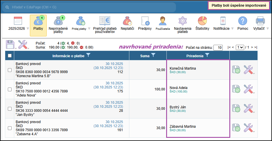 Systém na základe uvedených identifikátorov predpriraďuje platby k používateľom, na dokončenie je ešte potrebné potvrdiť prijaté platby - Priraďovanie platieb žiakom po importe z bankového výpisu