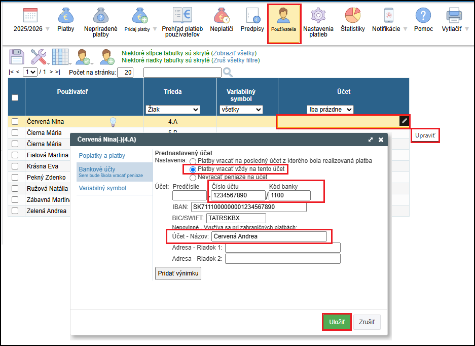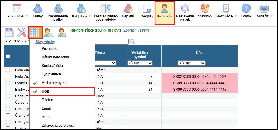 - bankový účet môže nastaviť aj samotná škola - v časti Používateliasi zobrazte stĺpec Účet: