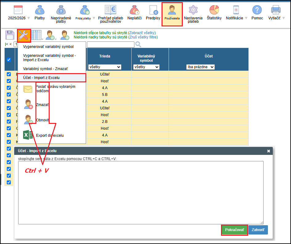 - ak máte zoznam bankových účtov (IBAN a názov účtu) spolu s menným zoznamom žiakov / učiteľov v excelovskom súbore, môžete ich importovať