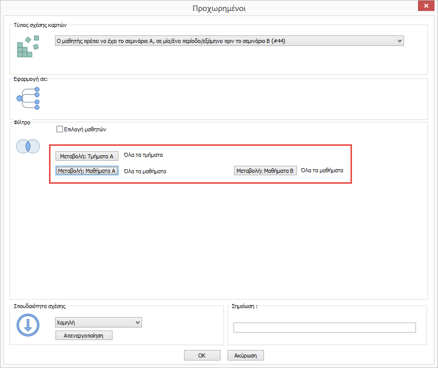 Εάν οι μαθητές πρέπει να παρακολουθήσει ορισμένο ένα ορισμένο μάθημα πριν από ένα άλλο μπορείτε να χρησιμοποιήσετε την ακόλουθη προχωρημένη σχέση καρτών