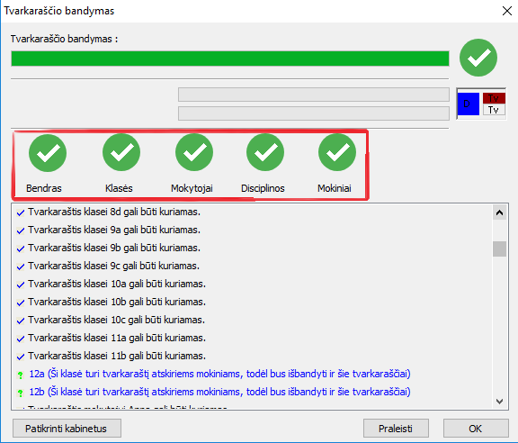 Šią funkciją galima pasirinkti komanda "Tvarkaraštis, Patikrinimas" - bus paleistas algoritmas, kuris pamėgins sukurti ir patikrins atskiras tvarkaraščio dalis.
