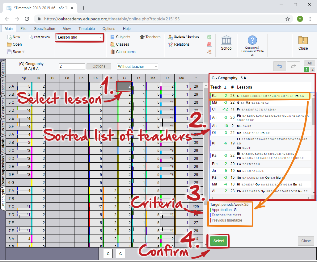List of teachers will be (re)sorted every time you select some lesson in grid. The top-most teacher is the one that the program thinks is most suitable for the selected lesson. You can assign teacher to lesson with double click on the row.