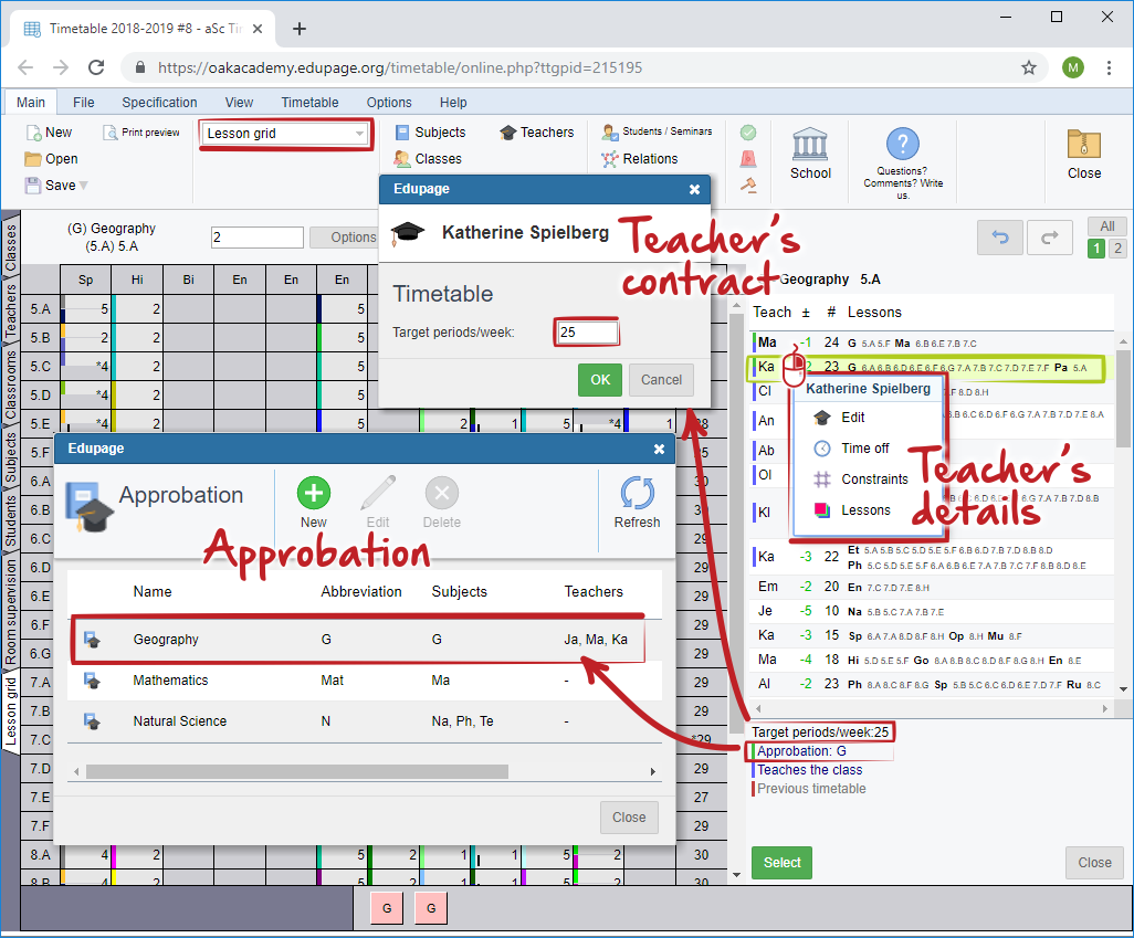 By right click on teacher's name you can edit teachers details, time-off, constraints and lessons.
