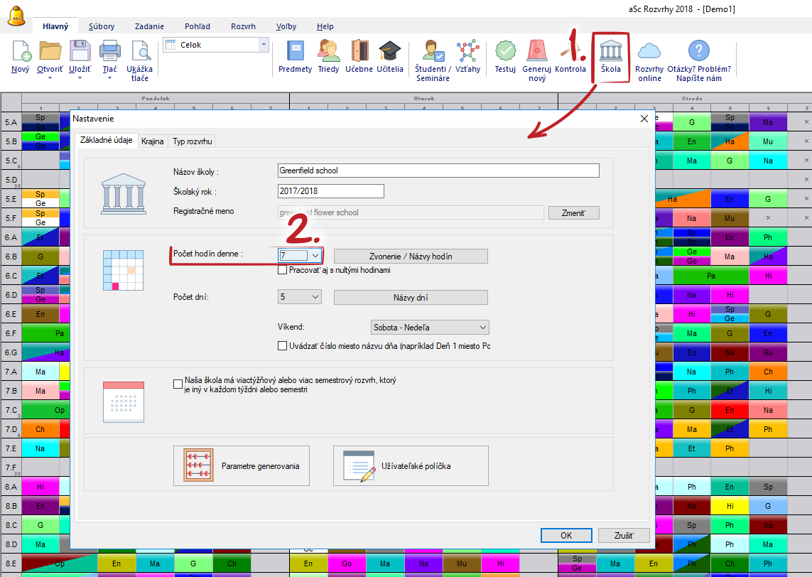 - Tento počet je maximum, koľko hodín máte na škole za deň. Softvér automaticky rovnomerne rozloží počet hodín za deň. Takže, aj keby ste nastavili tento počet na 15 a trieda 1A má 30 hodín týždenne, program stále umiestni iba 5 - 6 hodín na každý deň.