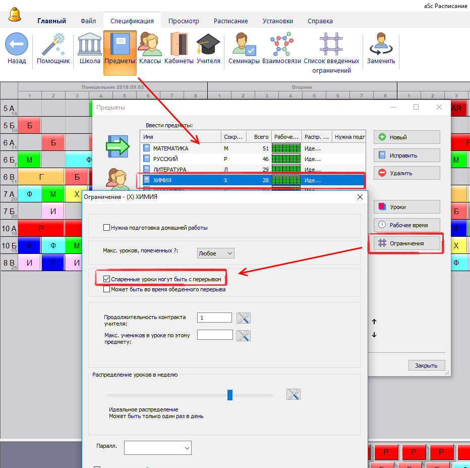Но Вы можете определить, что двойные уроки по некоторым предметам могут быть разделены обеденным перерывом, если первый урок поставлен перед этим перерывом; это можно сделать в окне ограничений предмета.