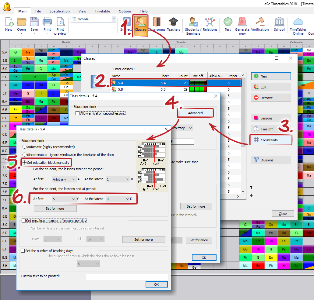 This automatic teaching block calculation is good for most of the schools. However if the class has 32 lessons and you want to allow 5-9 lessons each day, you have to set the teaching block manually.