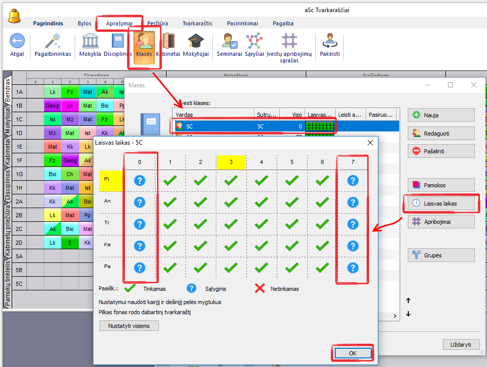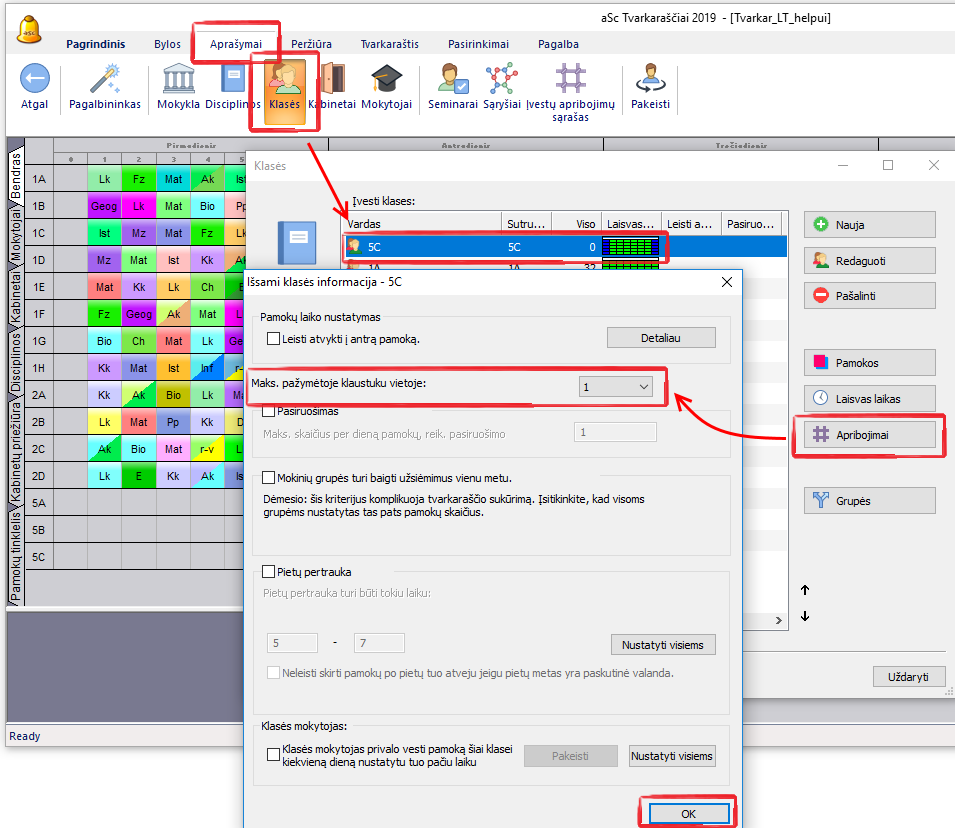 Tuomet užduokite, kad klasė gali turėti tik vieną pamoką pozicijose, pažymėtose klaustuku - tai galite padaryti klasės informacijos lange: