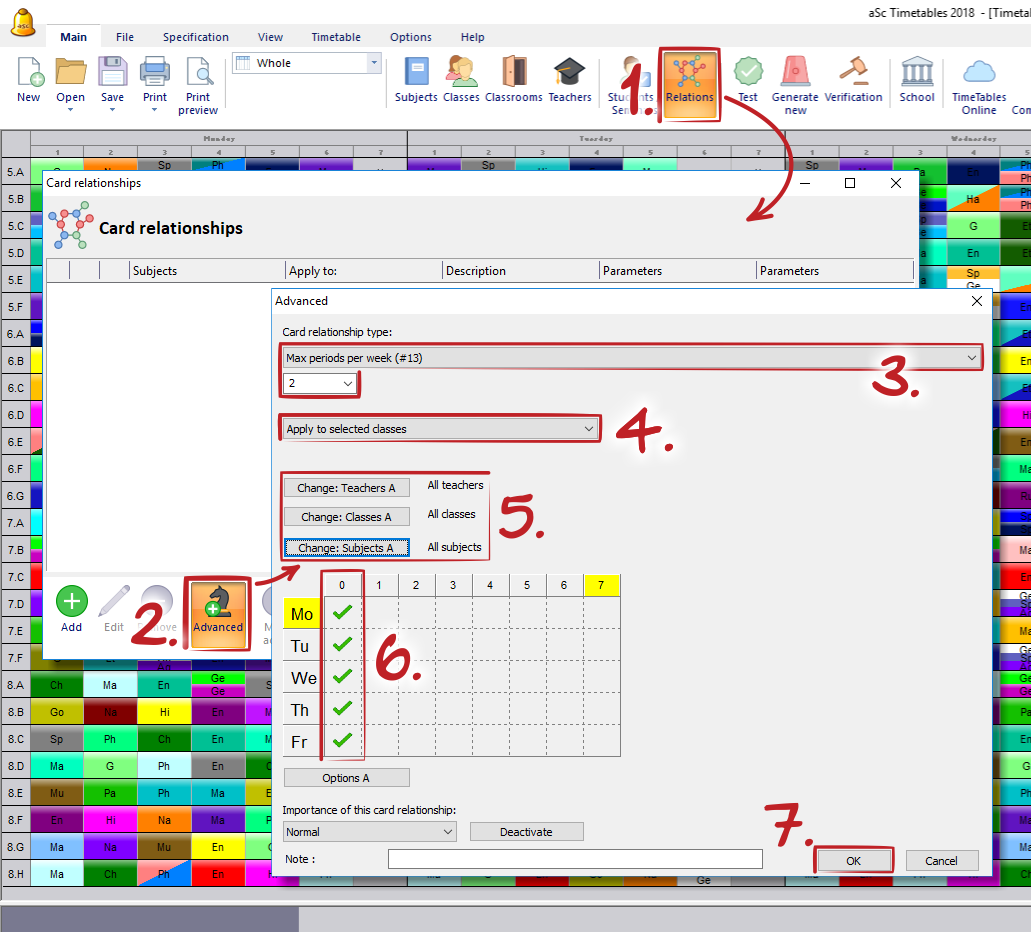 The simple solution cannot be used if you want to specify two conditions. For example the class has to have max one zero lesson and max one 7th lesson.