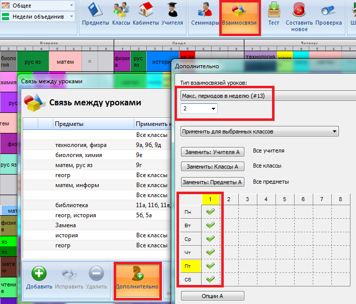 В этом случае Вы можете использовать дополнительные взаимосвязи уроков. Здесь Вы можете определить периоды и мaкс. число уроков в это время в неделю.