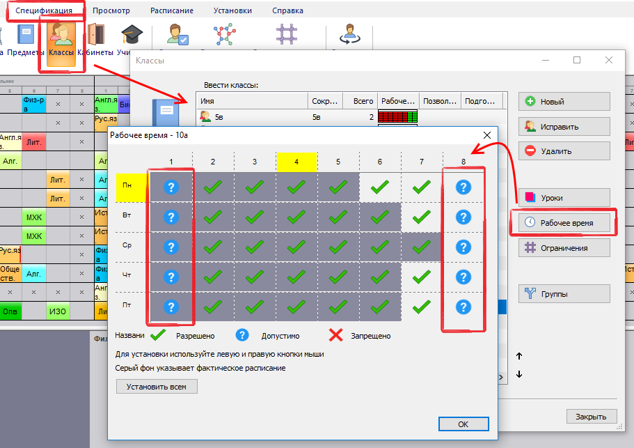 Мы определили, что все классы могут иметь макс. 2 урока на отмеченных позициях в неделю. Таким образом не случится, что один класс будет иметь 3 первых урока в неделю.