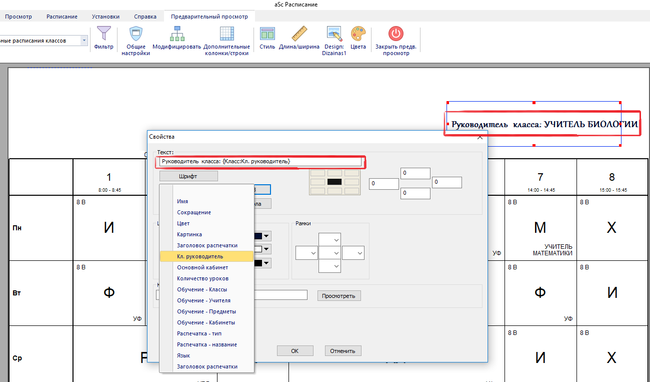 Как добавлять название класса, классного руководителя, основной кабинет в дизайн распечатки