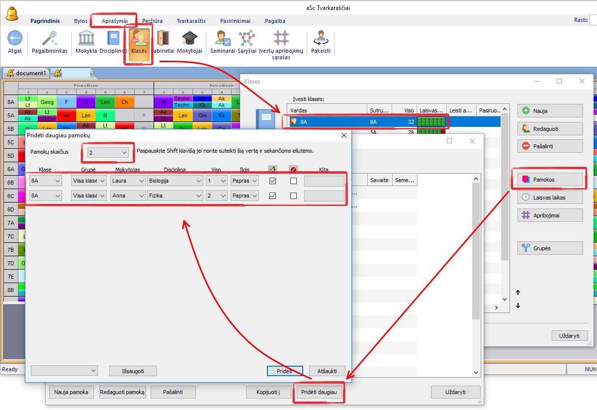 Kaip pridėti klasei iš karto kelias pamokas