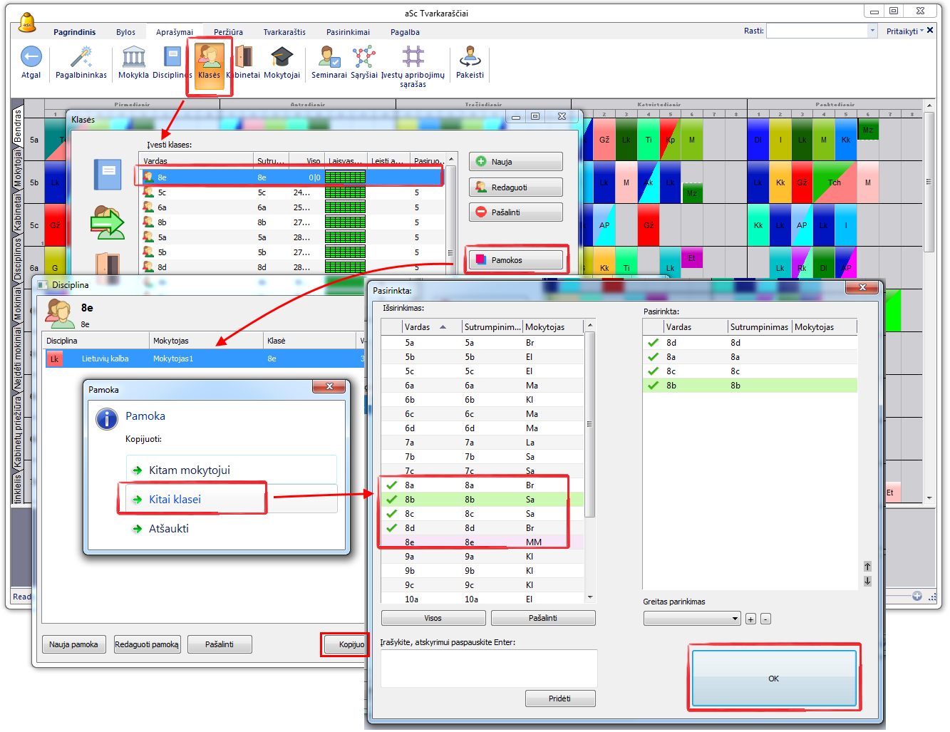 Pastaba 1: jeigu kopijuojate pamokas, kurioms dar nėra paskirtų klasių, programa paklaus, kokiems mokytojams šios pamokos turi būti paskirtos.