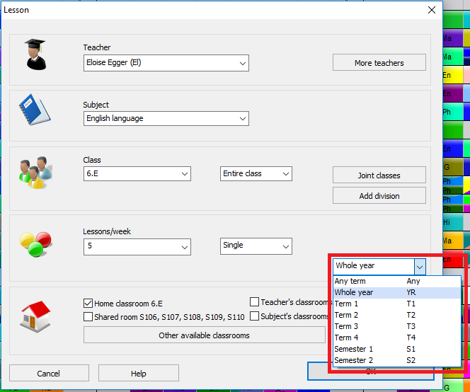 For each lesson, you can define in which terms this lesson can take place. You can specify one term, or you can say it can be in any term or on all terms. Moreover, you can say the lesson has to be in T1 and T2 or on T1 OR T2 or T4.