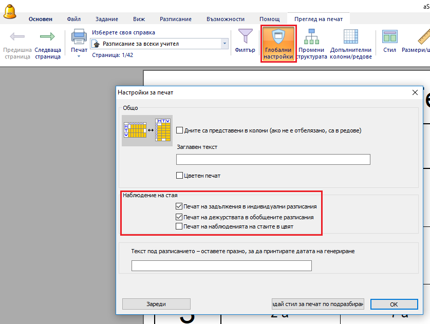 В меню Преглед на предпечат/ Глобални настройки можете да отбележите какво искате да принтирате - дежурствата в индивидуалното или обобщаващото разписание.
