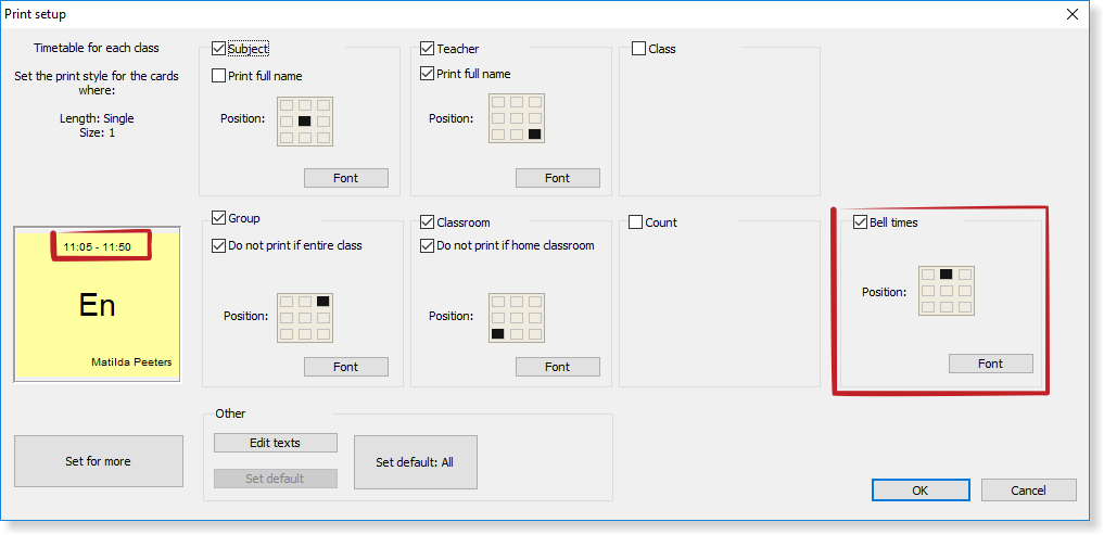 By default the software print the bell times bellow the period number.