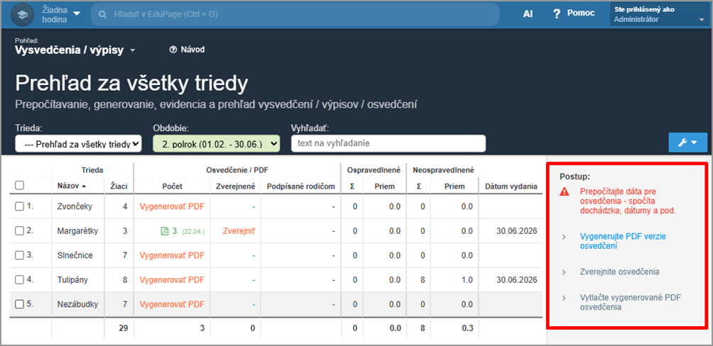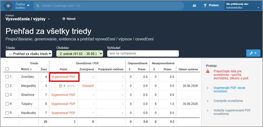 Zobrazí sa Vám náhľad tried s počtom žiakov. Na pravej strane obrazovky vidíte Postup. V prvom kroku je potrebné prepočítať dáta, v opačnom prípade sa Vám nezobrazí dátum vydania osvedčenia.