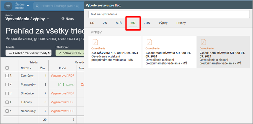 EduPage umožňuje materským školám vytvárať osvedčenia o získaní predprimárneho vzdelania pre svojich žiakov.