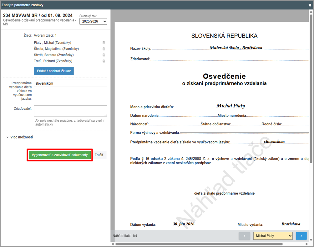 Zobrazí sa okno s parametrami zostavy. V ľavej časti viete skontrolovať, či sú tam všetci žiaci. Prípadne, ak niektoré dieťa z tej triedy pokračuje ešte v MŠ a nevydávate mu osvedčenie, tak ho viete odobrať alebo naopak pridať ďalšie dieťa z inej triedy. Vyplňte pole pre vyučovací jazyk. Skontrolujte zostavu. Ak je v poriadku, tak kliknite na "Vygenerovať a zaevidovať dokumenty".