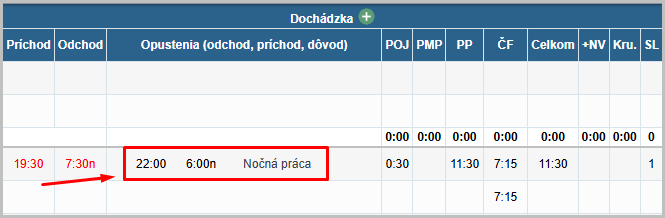 Pre potreby značenia aj presného rozpätia časov nočnej práce, sme pridali automatickú funkciu zobrazovania aj v opustení: