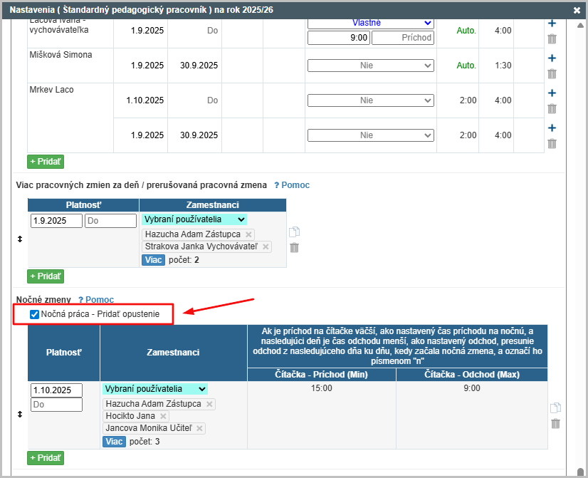 V Štandardnom zamestnancovi cez "Nastavenia - Štandardný pedagogický alebo nepedagogický pracovník - Dochádzka" vyberieme možnosť "Nočné zmeny" a cez tlačidlo "Pridať" zvolíme zamestnancov, ktorých sa to týka, a nastavíme si dátum "od" platnosti. Nezabudneme zmeny uložiť .