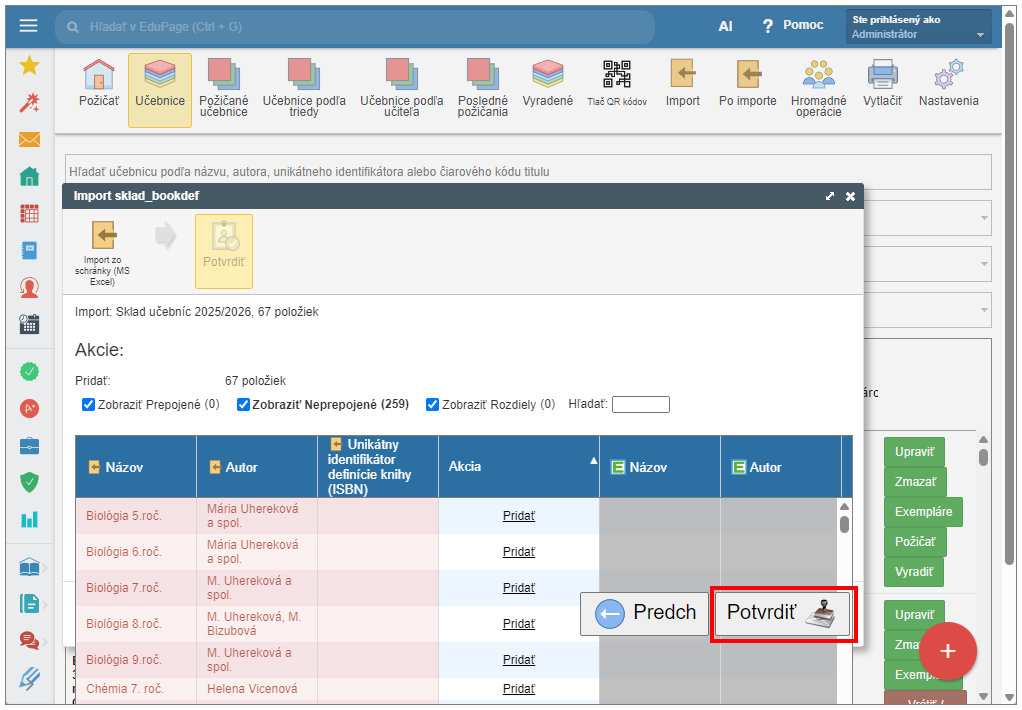Zobrazí sa tabuľka importovaných údajov s možnosťou voľby Akcie - rozhodnutia, či sa majú predmetné položky importovať, alebo nie. Voľbu môžete realizovať kliknutím na podčiarknutý text v stĺpci "Akcia". V prípade, že je všetko v poriadku, zvoľte "Potvrdiť". Údaje budú importované do vášho EduPage Skladu učebníc.
