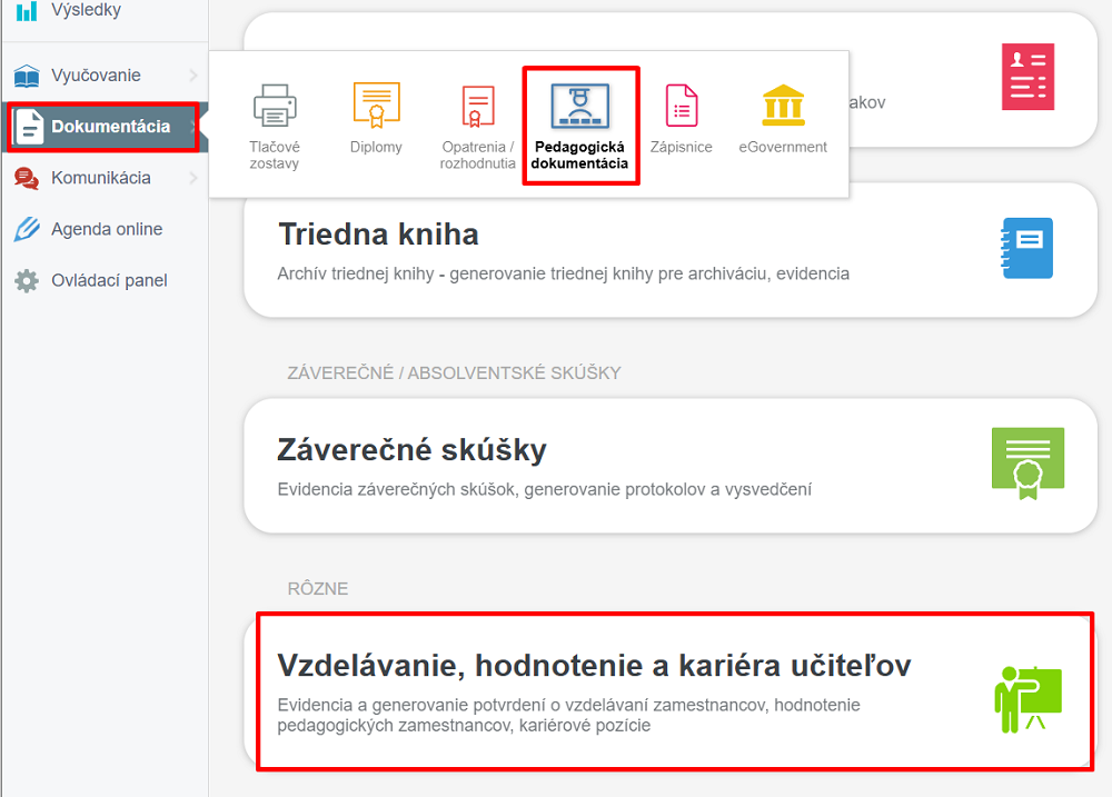 V ľavom menu zvoľte Dokumentácia/Pedagogická dokumentácia a Vzdelávanie, hodnotenie a kariéra učiteľov