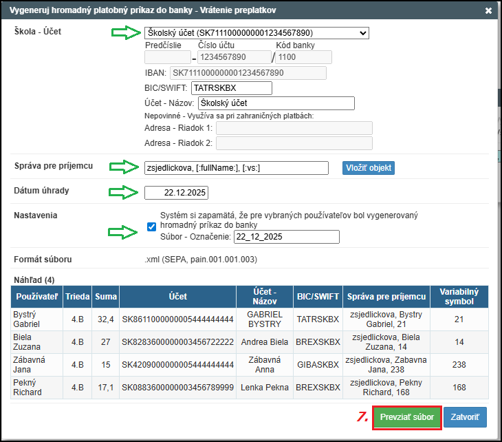 Pri samotnom generovaní súboru si môžete vybrať účet, z ktorého budú peniaze zaslané, môžete si upraviť správu pre príjemcu, zadať dátum úhrady a zmeniť názov súboru, ktorý bude uložený na EduPage. Podrobnejšie vysvetlenie jednotlivých položiek v hromadnom platobnom príkaze nájdete tu: Vrátenie preplatkov - ako vygenerovať hromadný platobný príkaz do banky (3. GENEROVANIE SAMOTNÉHO SÚBORU)