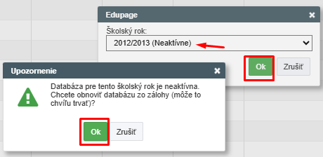 Poznámka: Ak sa starý školský rok zobrazuje v zozname s poznámkou "Neaktívne", zvoľte ho a potvrďte, že databáza preň sa má obnoviť zo zálohy: