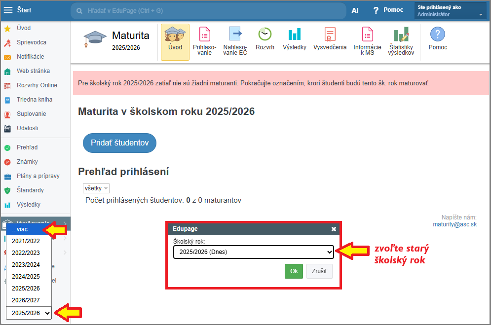 V module Maturita sa prepnite do školského roka, v ktorom bolo maturitné vysvedčenie vydané.