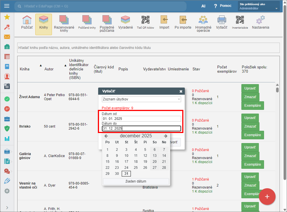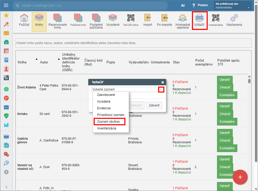 V module Knižnica/Sklad učebníc v hornom menu vyberte možnosť "Vytlačiť".