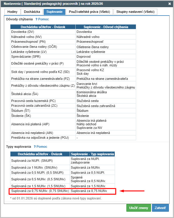 (*od 01/2026 používame za polovičnú hodnotu typ suplovania "Suplovaná hodina za 0,75 NUNv")