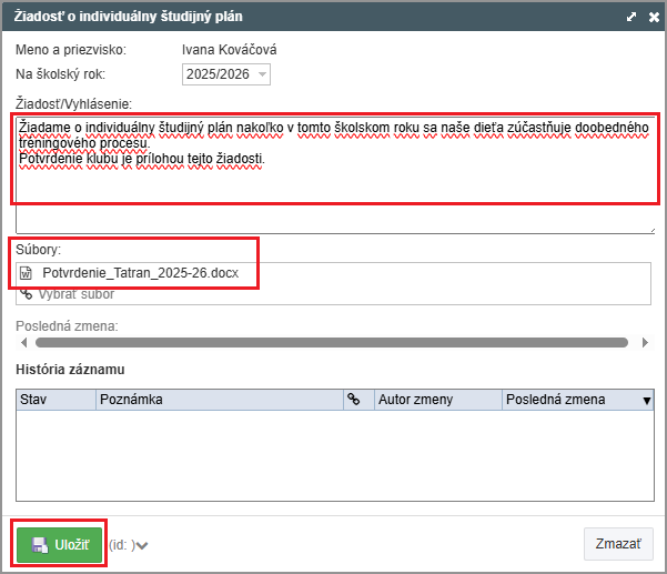 Po prihlásení sa na webe do rodičovského konta v module 'Žiadosti / Vyhlásenia' vyberte žiadosť pomocou tlačidla 'červené +' :