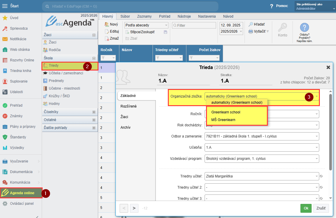 1. V našom prípade má škola dve organizačné zložky (Greenlearn school a MŠ Greenlearn). Automaticky sa triedam nastaví kmeňová škola, čo je v našom prípade Greenlearn school.