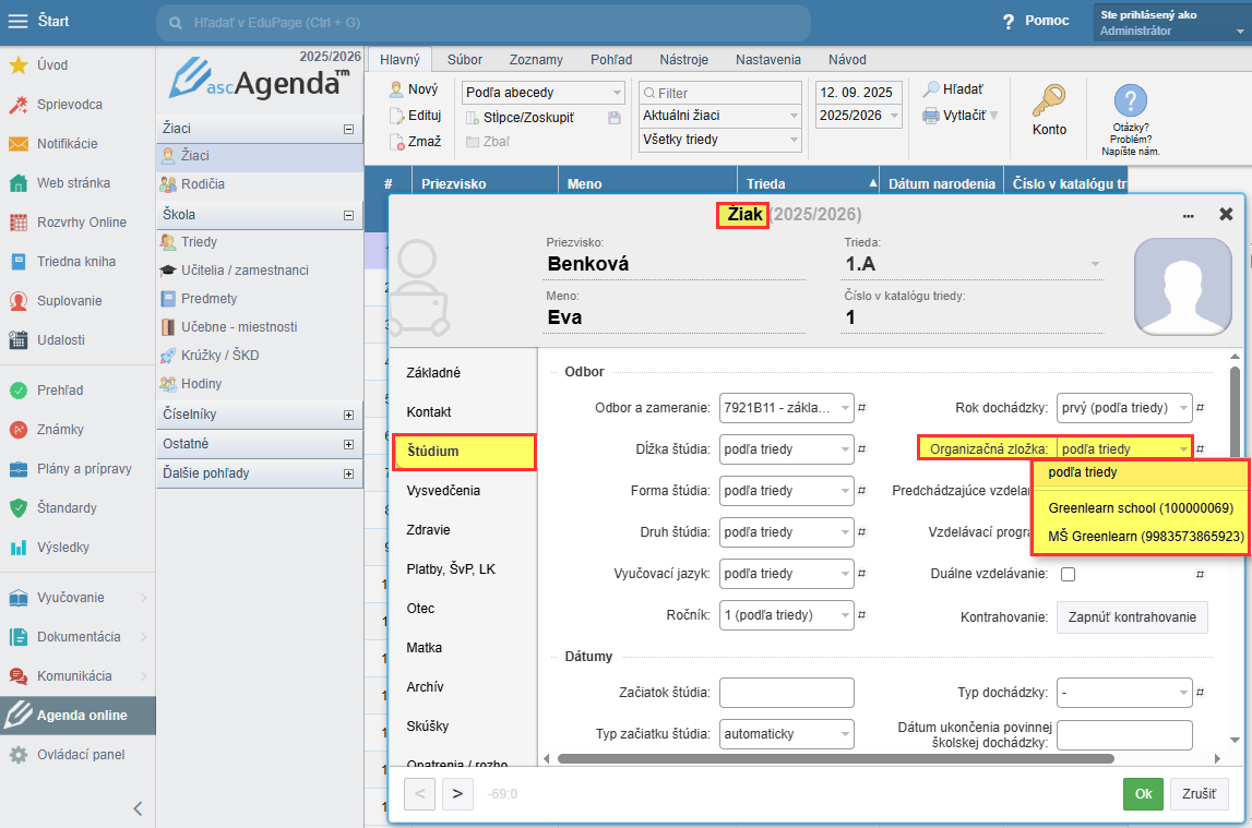 2. Žiaci majú vo svojej karte automaticky nastavenú organizačnú zložku podľa triedy. Ak ju potrebujete zmeniť, viete ju zmeniť aj tu a vtedy sa ignoruje priradenie žiaka podľa triedy a prioritu má nastavenie z jeho karty. Správne je však nastaviť triede správnu org. zložku.