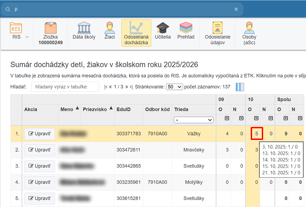 Po umiestnení kurzora myši na konkrétne číslo v dochádzke, v našom prípade na 5 ospravedlnených hodín sa zobrazia dátumy, kedy dieťa chýbalo. V materskej škole je povinné predprimárne vzdelávanie iba dopoludnia, preto sa pri dátume zobrazuje číslo 1/0, teda popoludňajšie chýbanie sa do dochádzky žiaka nepočíta.