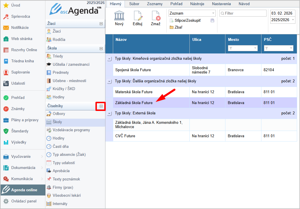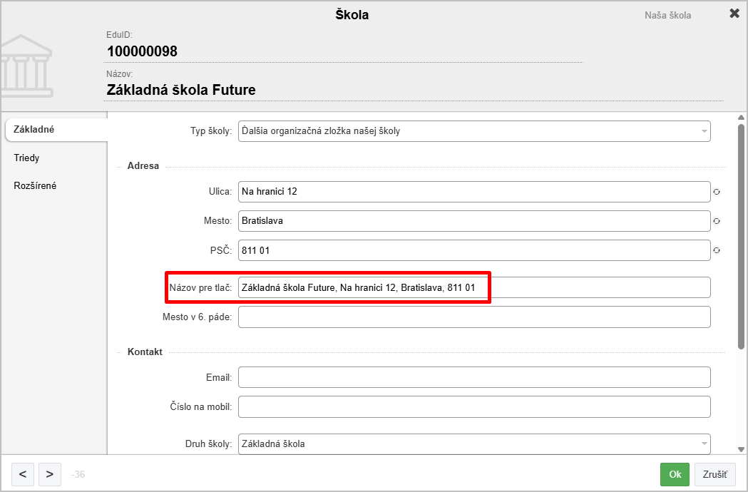 V triednom výkaze sa názov školy tlačí podľa toho, čo má škola nastavená v údajoch pre tlač: