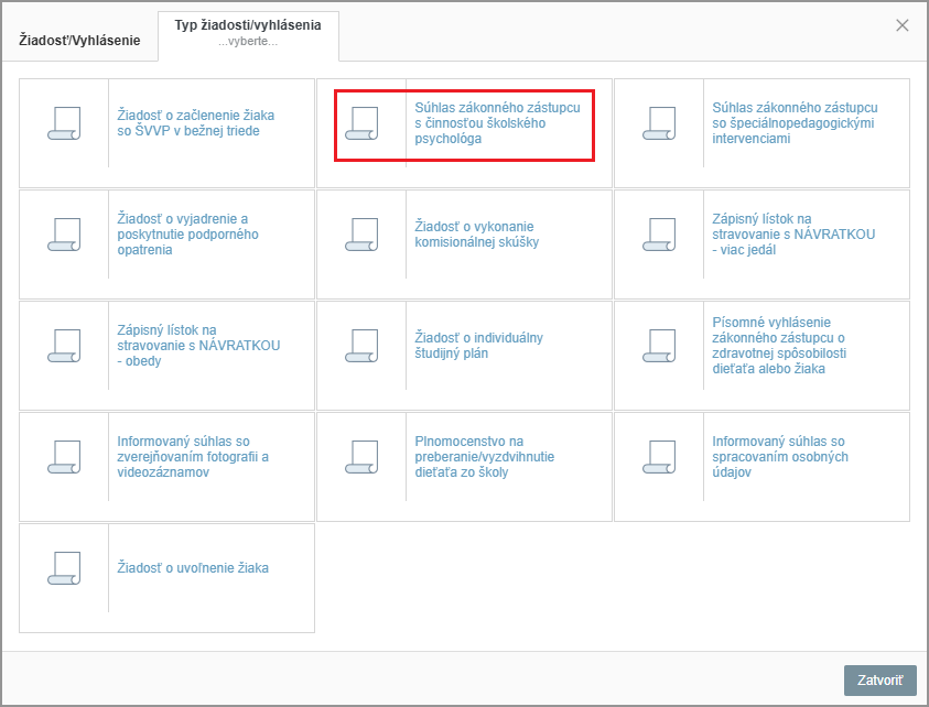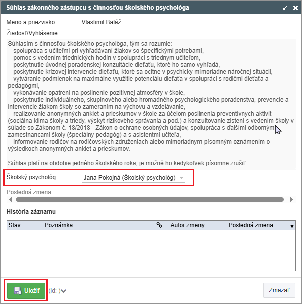 Zvoľte Súhlas zákonného zástupcu s činnosťou školského psychológa.