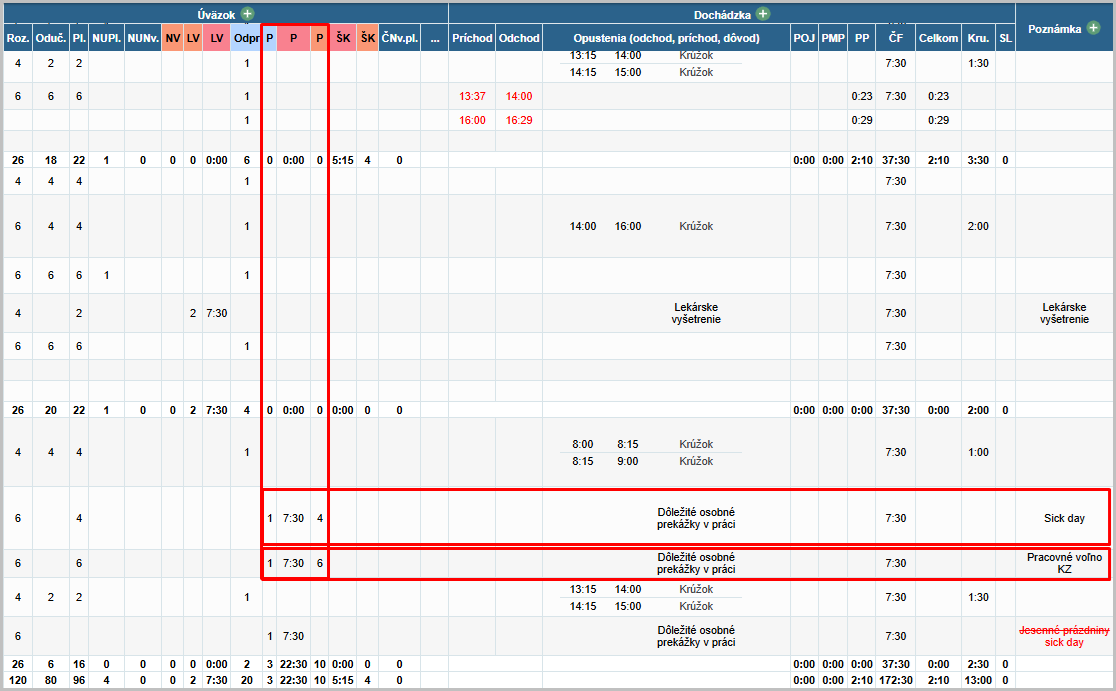 Benefit, ktorý postupne školy/škôlky zavádzajú, ako napr. dva dni "voľna podľa KZ" alebo tzv. "sick days", sa evidujú v dochádzke pod "Dôležité osobné prekážky v práci" v stĺpci "P":