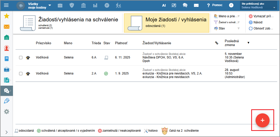 Prihláste sa do svojho učiteľského konta a v module 'Žiadosti / Vyhlásenia' pomocou červeného '+' vyberte konkrétny typ žiadosti: